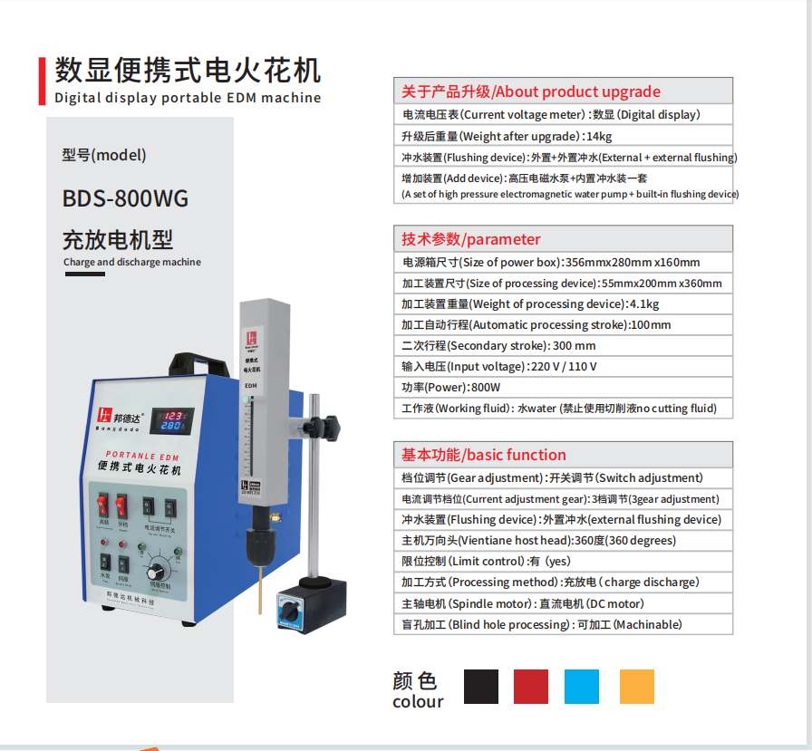 我是邦德達(dá)橘子23FE1D6A.png, 24小時(shí)為大家服務(wù)18018509558,有任何問題可來電或加V咨詢(微信同號(hào))淘氣店鋪:邦德達(dá)機(jī)械工廠直銷店 邦德達(dá)機(jī)械工廠直銷店邦德達(dá) BDS-800WG 便攜式電火花機(jī)取斷絲錐機(jī) 24小時(shí)服務(wù)熱線:18018509558(橘子)常規(guī)款機(jī)型,增加一套內(nèi)沖水裝置,加速排渣,提高加工效率,其產(chǎn)品價(jià)格實(shí)惠,功能齊全,帶限位,加工完畢自動(dòng)停止。產(chǎn)品主要用于去除斷在工件中的絲錐,并且對原有的工件沒有任何傷害,還可以取斷在工件中的常規(guī)鉆頭,小的螺釘螺絲。機(jī)頭也可以任意旋轉(zhuǎn) 可加工垂直孔徑、斜孔等。方便在大工件上取折斷絲錐、鉆頭等,該設(shè)備體積小,重量輕,輕松手提,操作簡單,穩(wěn)定可靠,工廠技術(shù)一對一視頻指導(dǎo),一年保修,終身維護(hù)。24小時(shí)內(nèi)全國多倉發(fā)貨,順豐包郵,可開發(fā)票
