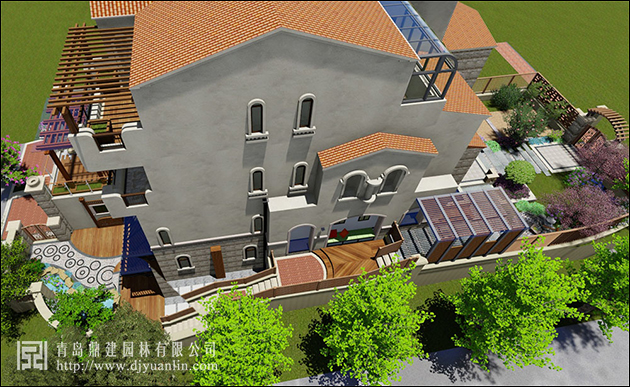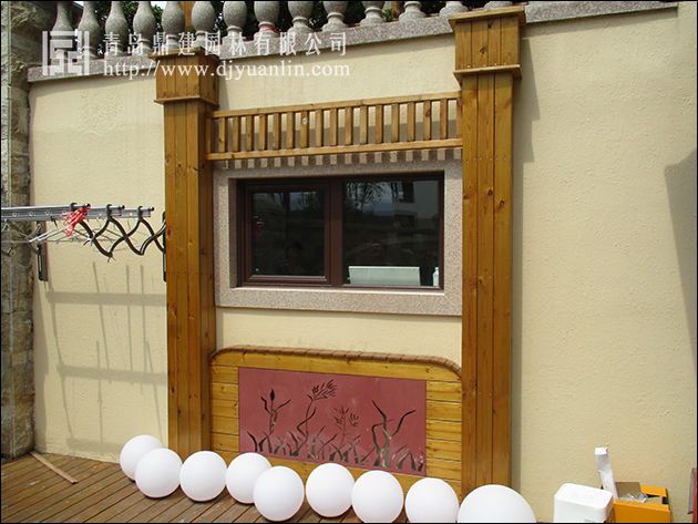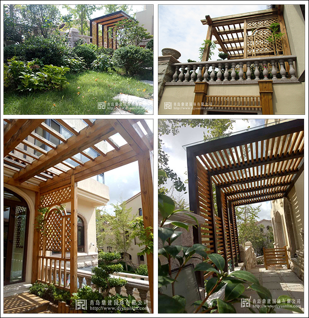 鋼架結構與防腐木結合,頂面鋼化玻璃壓頂,彰顯大氣。二樓廊架旁的凌霄勢頭正旺,相信不多時就會形成天然簾帳,散著花香充滿浪漫色彩。