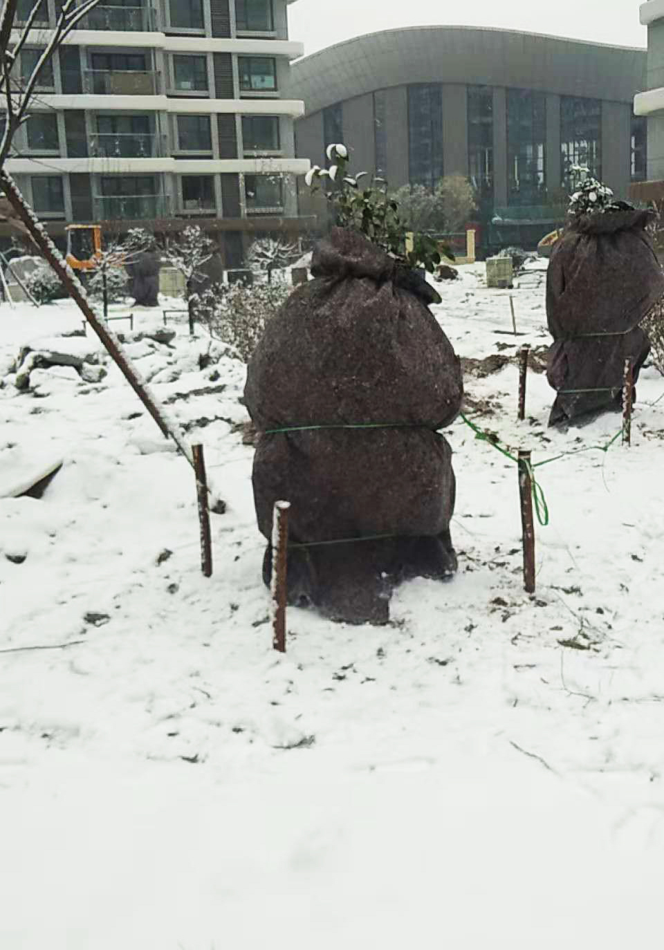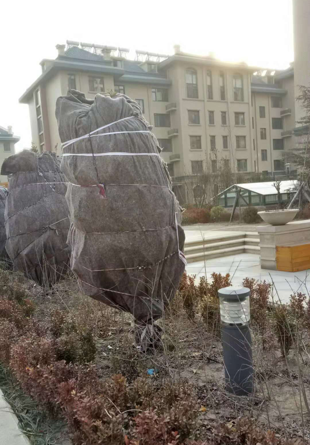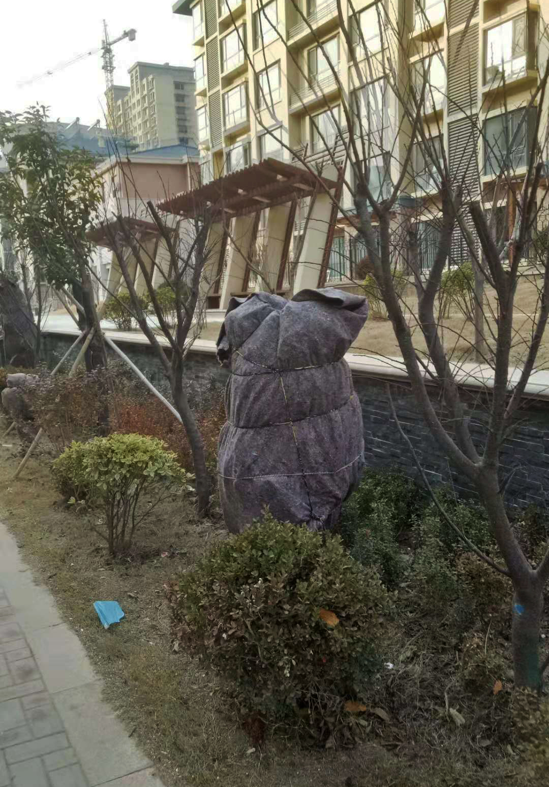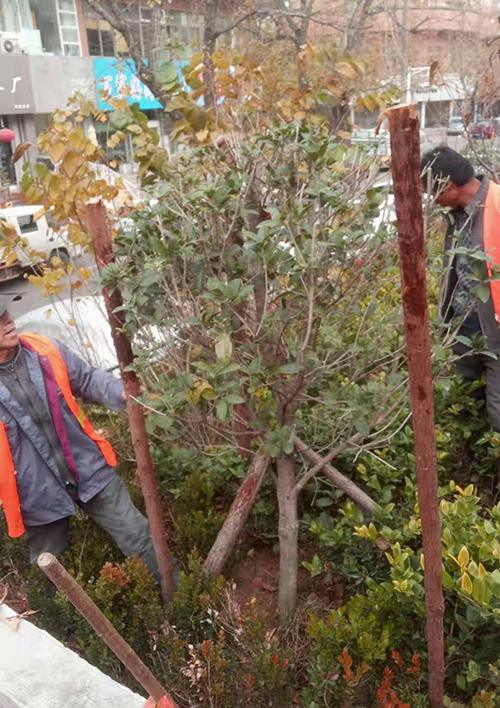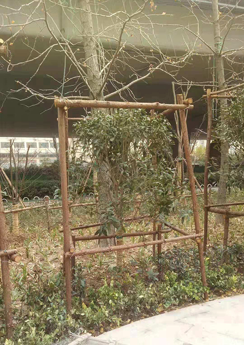 對于南種北移的球類:大葉黃楊球、紅葉石楠球、海桐球、金葉女貞球、構(gòu)骨球等使用草簾圍裹或者彩條布包扎等措施保溫保護(hù)。